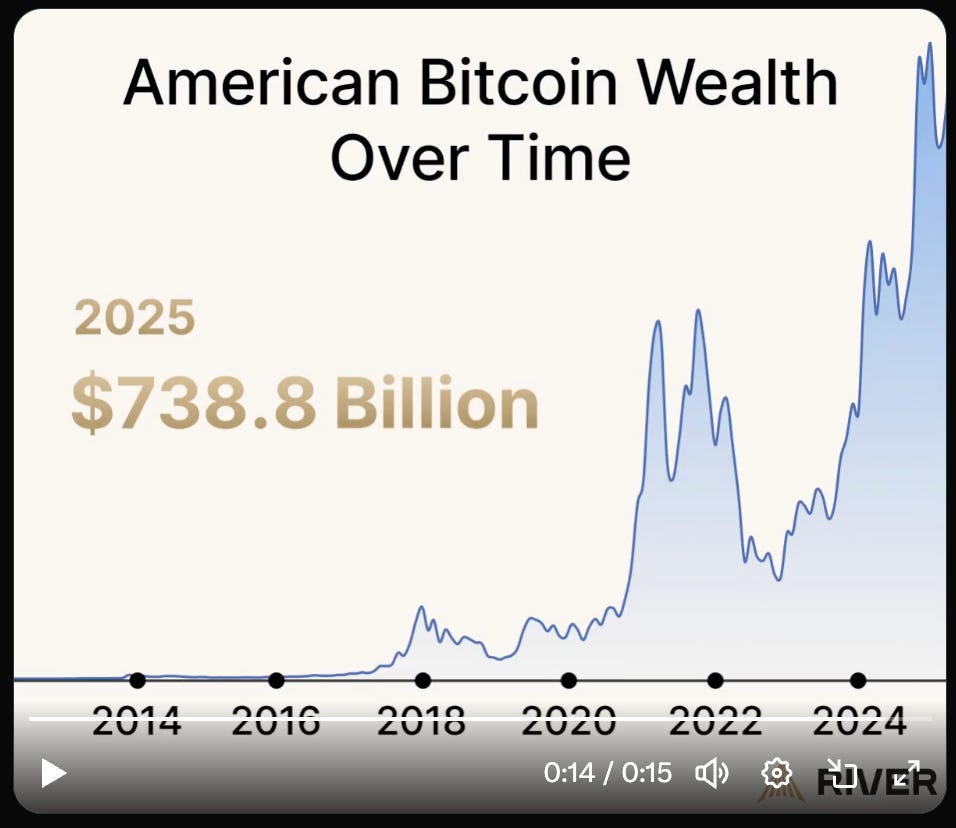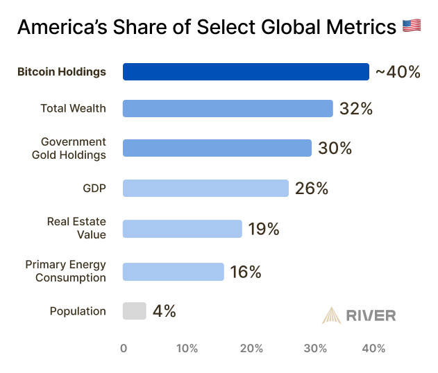 ●Riverのレポートによると、米国が利用可能なBitcoin全体の約40%を保有。 人口の14.3%がBitcoinを所有