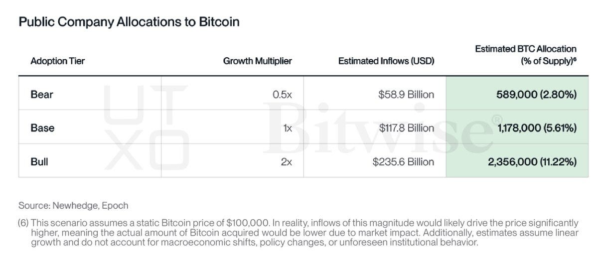 ●BitwiseとUTXO、上場企業が2026年末までに100万BTC以上を保有する可能性があると予測