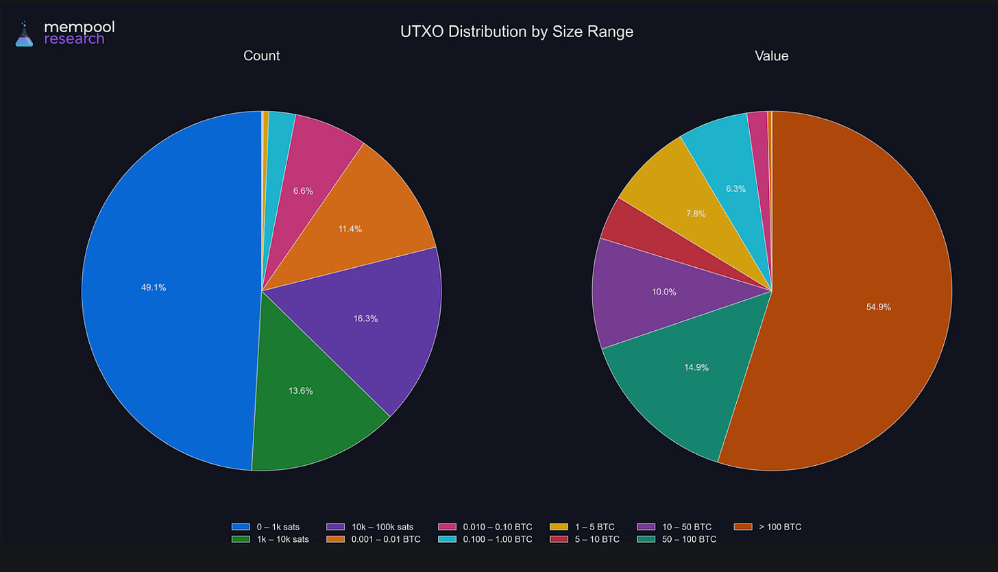●Mempool Researchによると、UTXO のほぼ半分が 1000satoshi未満であり、約30%がinscription関連