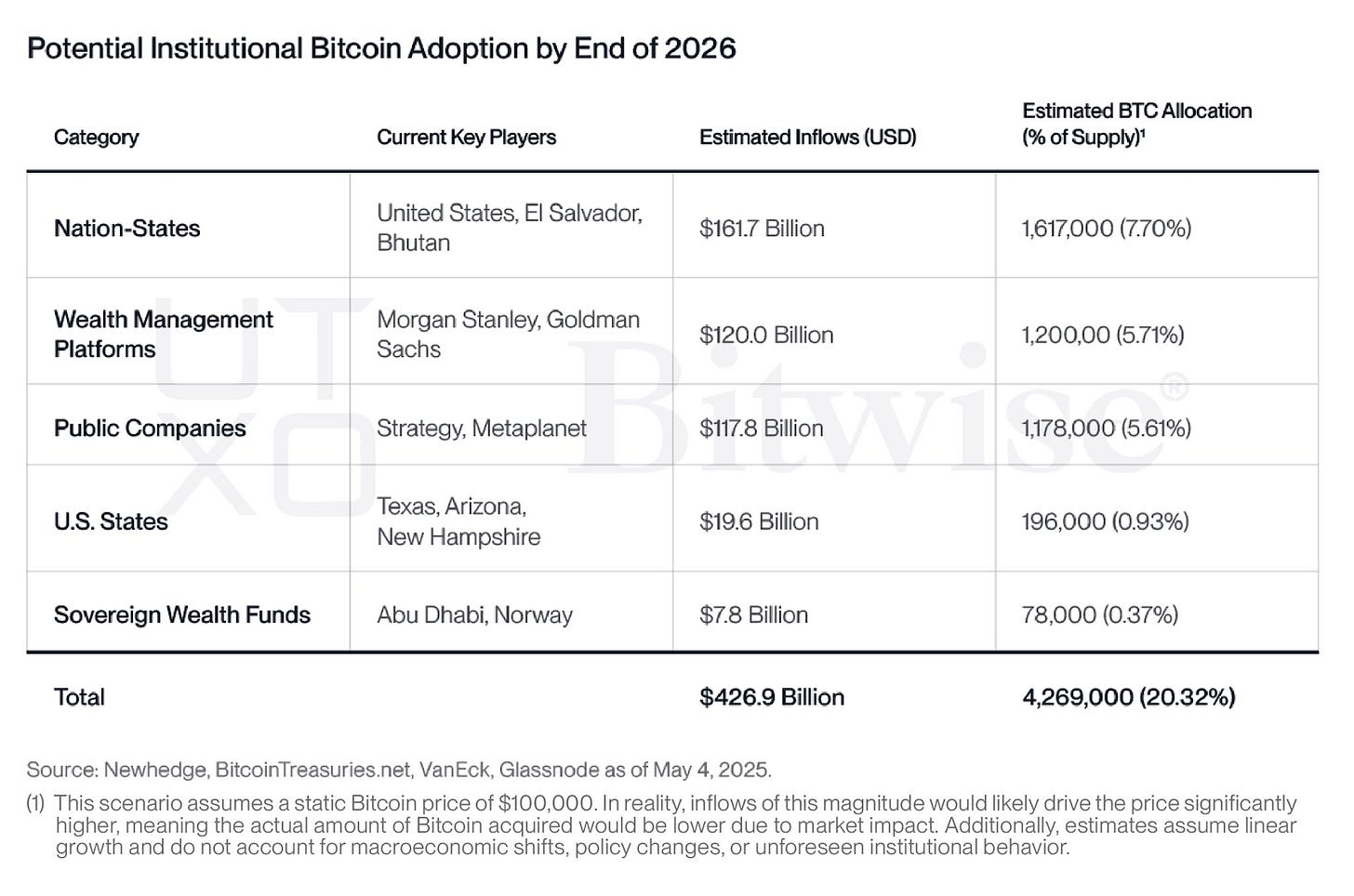 BitwiseとUTXO、2026年末までに国家やウェルスマネジメントおよび上場企業で$426.9Bを保有することになると予測
